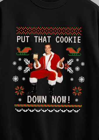 Featuring a fun “Put the Cookie Down” Arnie movie-inspired graphic, this crew neck jumper combines holiday cheer with classic action-movie humour. Made from soft, premium cotton-blend fabric, it’s ideal for Christmas parties, family gatherings, or cosy winter evenings.