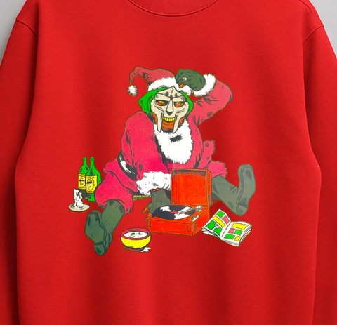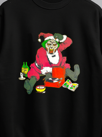 Bring the metal-faced mischief into your holiday season with this DOOM Holiday Spirit sweatshirt. Featuring a bold, original illustration of a DOOM-style Santa Claus kicking back with vinyls, 40s and a signature grin — this crewneck fuses underground hip-hop energy with festive chaos.